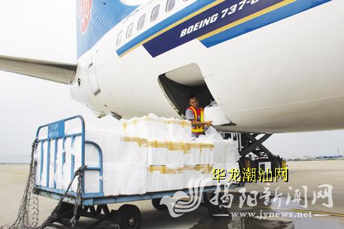 6日,南航汕头航空有限公司获悉一批发往昆明疾控中心支援鲁甸地震灾区的40件905公斤“流感疫苗”,需从上海经揭阳潮汕机场转运至昆明后,迅速调整当天最早一班飞往昆明的CZ3857航班货运舱位,优先安排救灾物资装载入舱,并全力保障航班准点起飞。据了解,该航班于当天11时11分顺利抵达昆明机场,比原计划提前了14分钟。图为揭阳潮汕机场工作人员正把救灾物资装载入舱。
