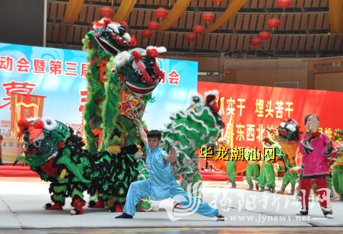 通过鼓点排阵,八头狮子迎宾,四头狮子进行技巧表演,为观众献出了市运会开幕式第一个节目。孙淑强说,表演寓意预祝比赛成功,同时带给运动员鼓励,群狮起舞,给运动员们斗志上起到鼓动作用,因为狮子刚劲有力,希望给运动员带来精神上的鼓舞,赛出好成绩。