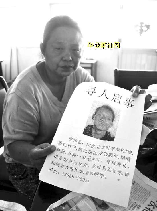“我的儿子失踪了……”话还没讲完,52岁的母亲胡金兰眼泪就掉了下来。这位寻子心切的母亲,就是6年前震惊一时的丹霞庄“4·19”恶性抢劫案中的重伤女事主倪海芳的母亲。7月底,胡金兰与儿子从湖北黄岗一路颠簸至汕头,希望到汕为倪海芳争取到未获执行的赔偿费用。不料,8月2日,儿子倪伟强却在陈厝合一带失踪了。“倪伟强,18岁,出走时穿灰色T恤,黑色裤子,黑色拖鞋,皮肤黝黑,眼睛斜视,身材瘦长,出走时身无分文……”胡金兰拿着“寻人启事”,她走到哪贴到哪,沉重的脚步走遍汕头的大街小巷,已是几天几夜吃不上饭睡不着觉,无助的母亲眼睛红肿,脸色憔悴,寻找儿子似乎成了她能坚持下去的唯一精神支柱。