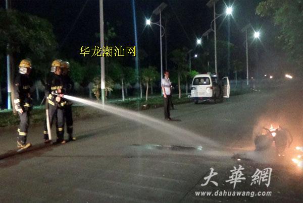 8月13日凌晨零时许,在龙湖区蓝水星路段一家污水厂门口,一辆行驶中的摩托车突然自燃,车主及时弃车离开没被烧伤。此时摩托车倒在路边绿化带,油箱被烧裂,火光冲天。龙湖消防一中队接警后马上到场处置,经过2分钟将火灾扑灭,避免了绿化带被“祸及”。 本报记者 林子海 林鹏 摄