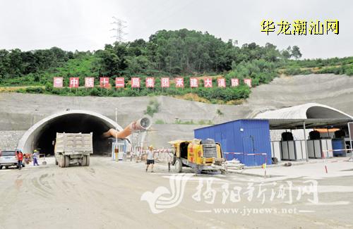 汕湛高速揭博项目T1标大溪隧道设计为左右线分离,左洞长1078米,右洞长1070米,单线隧道总长2148米。自去年开工以来,左洞已完成636米,右洞已完成500米,累计完成1136米,全部合共已完成隧道总工程量的52.9%,工程技术人员正日夜奋战,力争按时按质完成工程任务。图为位于揭西的大溪隧道正在加紧建设。