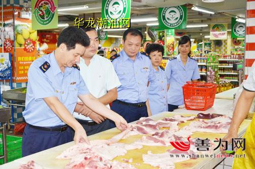 中秋佳节即将来临,陆丰市工商管理人员突出重点,多措并举,从事前防范入手,加大对服务业、集贸区、超市商场等经营主体的巡查力度,加强市场监管,确保市场繁荣稳定。图为陆城工商所人员在一肉类档口巡查。 汕尾日报记者 曹楠楠 通讯员 林保虔 摄