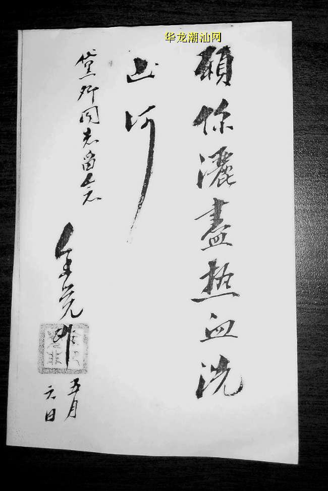 “黛卿同志留念 振吾国魂 书于意溪军次 岐良”。背面写的通信处是“揭阳棉湖钱坑西门钱新学校转”。