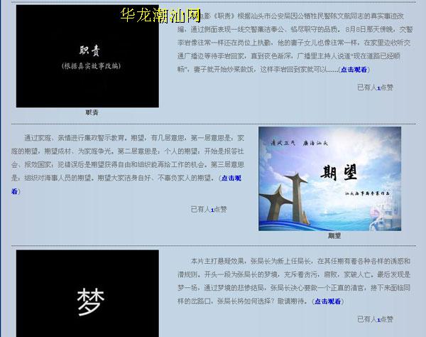 本网讯:“清风正气,廉洁汕头”微电影作品征集活动近日结束,目前进入初选阶段,符合要求的征集作品将陆续上传展播,欢迎广大网友登陆大华网( http://www.dahuawang.com/ztxw/lzwdy/zp.js )为喜爱的作品点赞。