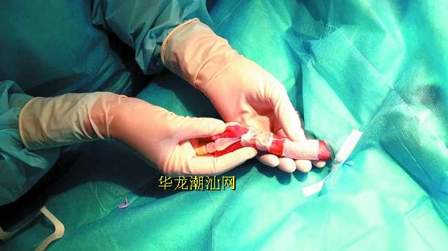 家在潮阳谷饶镇的产妇洪女士,在怀孕28周时,患有严重的“妊娠高血压综合征”,已经危及产妇的生命,不得不提前终止妊娠。今年6月12日,洪女士在汕头市中心医院施行剖宫产手术,产下一名体重仅有850克、身长约32厘米的袖珍男婴。婴儿出生时没有啼哭,也没有呼吸,大概只有成人的手掌大小,现场医护人员都为他捏了一把汗。经过刺激、吸痰、吸氧等复苏后,婴儿被紧急送入医院新生儿病区抢救,在新生儿重症监护室接受特医特护治疗。