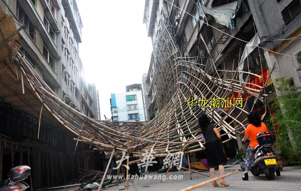 昨天下午,记者来到现场,只见该建筑楼西北两侧六层高的脚手架整片横卧巷道,靠在杏园西及玫瑰园南墩工业厂C座的外墙上,西面现场已有一辆吊臂车正在作业。由于脚手架不断下压,两边巷道仅剩不到三分之一的通行空间,过往行人皆小心翼翼低头路过,而脚手架倒落的“壮观”场面也吸引不少路过市民驻足观看。居住在附近的市民林先生告诉记者,昨天凌晨1点多,他在狂风大作中听到“哐当”一声巨响,往窗户一往,发现对面工地的脚手架掉落,他急忙下楼将停于巷道的车辆移走。“当时刮风下雨,还好没人路过,太危险了,不过这脚手架也太脆弱了,希望施工方加强牢固!”林先生说。