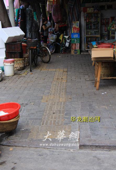 而在大华路,本来就不太宽敞的人行道被沿路的商户占为“自家地盘”,铺设在上面的盲道更是被堆积的货物“淹没”,已经几乎看不到盲道的存在。
