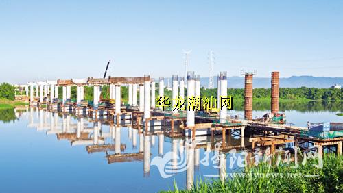 潮惠高速棉湖段榕江大桥全长1170.6米,共46跨,经施工方的连续奋战,目前已基本完成全部桩基础,占总工程量的60%.工程技术人员正抓紧灌注墩柱,争取今年年底前完成预制箱梁的架设工作。图为大桥施工场面。