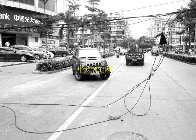 本报讯(记者 黄泽春 摄影报道)昨天上午,有热心市民向记者反映,在市区龙眼路一处路面上,有多根横架马路上空的光缆突然坠落,影响过往车辆通行,还存在安全隐患。