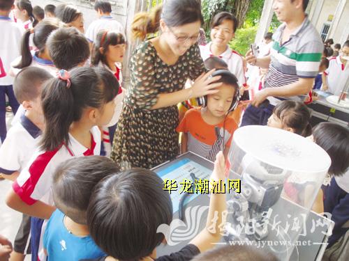 “看,这个机器人在招手,好好玩。”近日,一场别开生面的2014“全国科普日”科普进校园活动在榕城区淡浦学校举行,活动向该校学生展示科技成果,宣传科普知识。