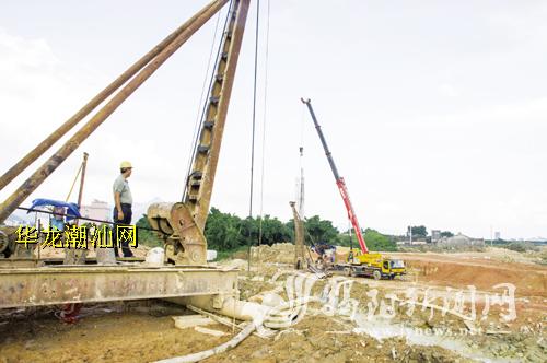近日,记者来到普宁市北环二路第一标段建设工地现场,只见技术人员正专心致志地焊接钢筋笼,3台冲孔桩机在施工人员的操控下,正在进行打桩作业;另一边,吊机“抓”起一个12米高的圆柱形钢筋笼,缓缓地放入地下……施工现场一片热火朝天。