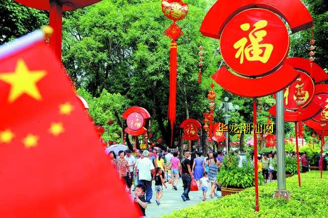 昨天上午9时许,记者在中山公园看到,福灯、三角彩旗、鲜花将园区装扮一新,十分喜庆。公园里,到处是三五结伴的朋友、扶老携幼的一家老小,每个人脸上都洋溢着过节的喜悦。无论是在游艺场,还是在动物园,处处都是欢声笑语,一片热闹。10时,在公园中心舞台,由市文广新局主办的“南粤幸福活动周”文艺汇演准时举行。汕头歌舞团的演员们为游客带来专场表演,吸引大批市民驻足观看,动听的歌曲和充满激情的舞蹈,赢得台下观众阵阵掌声,游客们一边欣赏精彩的演出,一边享受节日的喜庆气氛,好不惬意。据了解,国庆长假期间,中山公园“备下”多场文艺汇演,并有灯谜会、潮汕民俗图文展览、潮剧戏屏人物展览等。