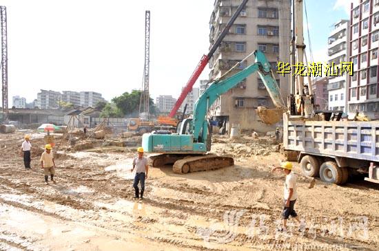 近日,记者在普宁市流沙北街道白沙陇旧区改造工程H区施工现场看到,旋挖机、挖掘机、泥土搅拌机在轮流作业,伴着机器轰鸣声,旋挖机正在进行钻桩作业,大型挖掘机挥动着巨铲,接二连三地将工地内的淤泥挖起,倒在工程车上,再由车辆将淤泥运出……