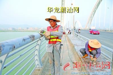 由于长时间的风吹日晒雨淋,市区金山大桥两侧的部分护栏已生锈损坏。昨天,潮州市韩江大桥管理中心组织专业人员,对金山大桥两侧护栏进行打磨除锈,并准备重新刷上防锈漆翻新维护,确保大桥安全美观。本报记者 陈宏文 摄