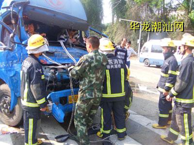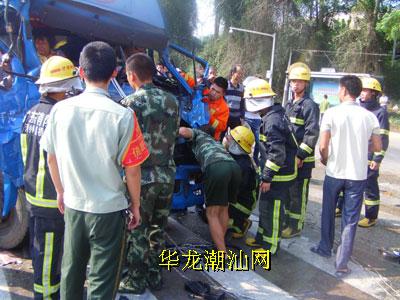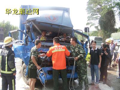 本报记者 刘漫娜 昨天下午1点45分左右,汕汾高速公路延长线溪口亭路段发生一起交通事故,一辆载有海鲜的货车撞上一辆集装车的后厢。事故造成3名人员受伤,其中货车司机与副驾驶座上一名妇女被困驾驶室,情况十分危急。 记者赶到时,消防、交警及120救护人员正在现场展开救援。记者见到,集装车的备用油箱正渗透着大量的汽油,而货车的车头已严重受损变形,碎玻璃洒落一点,司机和副驾驶座上的一名妇女双腿都被变形的车头卡住,无法移动脱险,情况十分危急。 消防官兵赶到现场后,先对事故现场进行勘查。“为了救出被困人员,我们出动救援车,用牵引车把货车车头变形的构件往外拉。”据现场消防官兵介绍,他们先将救援绳索往外拉,把副驾驶的妇女救出。随后,消防人员利用液压扩张器对变形车头进行破拆和扩张,好让驾驶员的身体可以慢慢移动。经过一个多小时的紧张救援,2名被困人员终于成功救出,并送往医院救治。 据了解,这辆载有海鲜的货车准备开往饶平,在经过汕汾高速延长线溪口亭路段时,撞上一辆横过集装车的后厢,事故还导致货车上另一名乘坐人员受伤。事故发生后,湘桥公安消防中队立即出动一辆多功能战车、一台抢险救援车、一台水罐车和10多消防官兵赶赴现场救援。目前,事故原因还在进一步调查中。