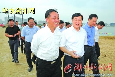 ▲昨天下午,梅州市委书记黄强(前左一)在市委书记许光等的陪同下,到潮州大桥仙洲岛建设工地考察调研。
