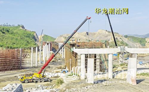 近日,记者来到揭西县大溪镇杨林枢纽潮惠主线桥建设工地,施工现场一片热火朝天。据了解, 潮惠高速TJ6合同段由中铁十四局集团有限公司承建,杨林枢纽主线桥位于杨林枢纽立交区,是汕湛、潮惠高速交汇点。自去年开工以来,72 根桩基已全部完成,系梁承台30座已完成29座。墩柱56个已完成54个,小箱梁预制及架设也已完成了一部分,合计已完成总座桥梁工程任务的56%.图为杨林枢纽主线桥施工场面。特约记者 李维照 摄