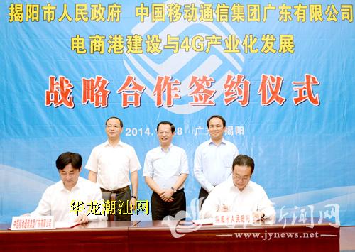 28日上午,市政府与中国移动广东公司“电商港建设与4G产业化发展”战略合作签约仪式在我市举行。根据协议,双方将在“基础网络设施建设、电商示范培训基地、21世纪海上丝绸之路电商港、传统产业升级改造、中德合作4G基地、4G产业生产基地”六大领域开展深入合作,携手推进电商港建设与4G产业化发展,致力将揭阳打造成为根植当地、辐射周边的“粤东电子商务中心城市”。市委书记、市人大常委会主任陈绿平,市委副书记、市长陈东,中国移动广东公司总经理钟天华等出席活动。