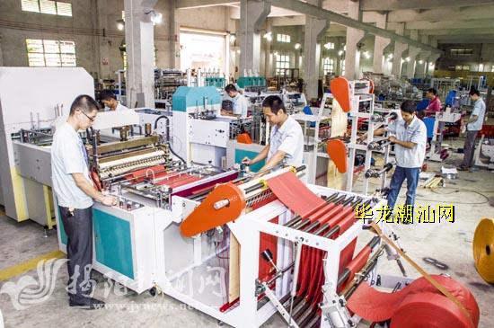 走进揭阳市群星机械实业有限公司(以下简称“群星机械”),只见数百平方米的生产车间里,整齐地摆放着十几台有机械手的高速制袋机,每台机器旁边站着一名工人,聚精会神地看管着设备。