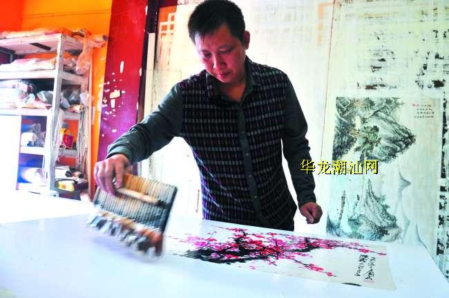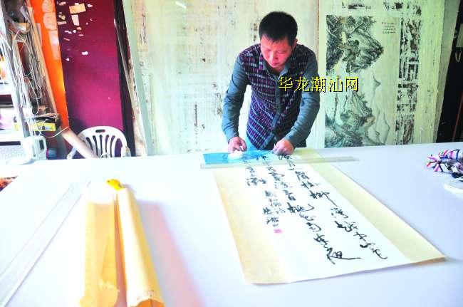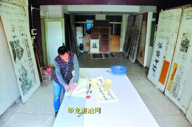装裱是我国历史悠久的传统手工技艺。在汕头,字画装裱属于“冷门”行业,市区不过十几二十家,一些还是没有招牌的工作坊,装裱画工靠的是“手艺”赚名气。在中山路177号2楼的一处居民楼中,装裱画师胡耀银每天都有忙不完的手工活。不少人慕名而至,有的从潮阳、普宁等地方赶来,除了前来为新作字画装裱,更多的是请他帮忙修复残缺的旧字画。