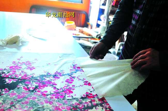 “装裱旧字画比装裱新字画要多一个工序”,胡耀银说,需要先给旧字画“脱底”,即把之前装裱上的宣纸和字画分离开来,这也是最考验装裱画工技艺的。据介绍,若是机器装裱,则无法脱下底纸,没办法修复,所以一般顾客是不舍得将名家名画拿去用机器装裱的。他边介绍边演示,首先旧字画要用水泡软,再谨慎地将底纸揭开。说着,他将汕头一画家的一幅画底纸小心翼翼揭开,紧接着,在画的背面轻轻涂上一层稀浆糊,再把一张新宣纸覆盖在上面,贴到一块木板上晾2-3小时……