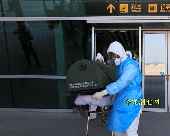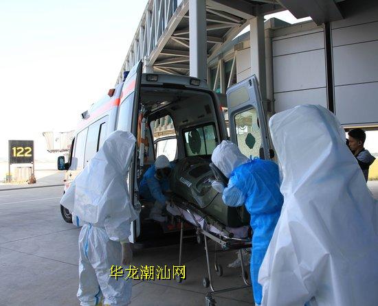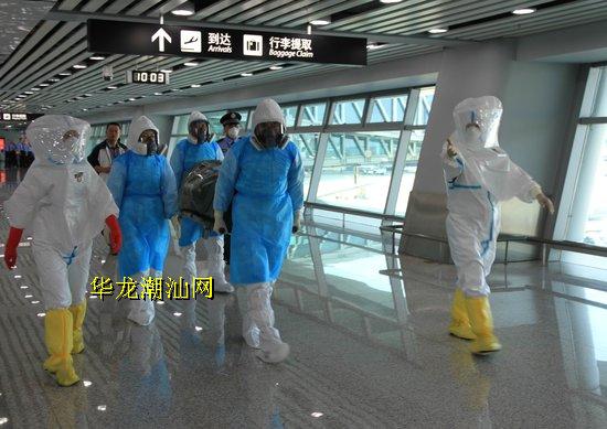 今天上午,潮汕机场举行“埃博拉”出血热疫情防控应急演练,演练模拟一旅客从西非某国乘坐入境航班抵达潮汕机场时,出现发热(38.8℃)、头痛等症状,机场检验检疫部门对其进行检查,发现符合“埃博拉”疑似病例诊断标准。潮汕机场公司、机场检验检疫、医疗卫生等相关部门立即按应急处置程序,开展病人转运、现场隔离、卫生处理、密切接触者管理等工作。(祝晓昌、陈珑摄影报道)