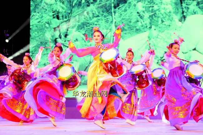 在“序·盛世潮风”节目《鼓舞神韵》中,传统潮汕大锣鼓加入动感舞蹈动作,与英歌舞相映成辉,这个新意十足的节目,为汇报演出拉开帷幕。一群维族姑娘翩翩起舞,引出第一乐章“天山风光”,仿佛把观众带到雪山脚下、青翠牧场。在第二乐章“西南风月”中,花腰彝族新娘、多情傣家少女以及藏族姑娘纷纷登场,悠扬的葫芦丝乐曲让人感受到西南的旖旎。随后的第三乐章“草原风情”,呈现出草原各民族如朝鲜族、蒙古族舞蹈豪放、粗犷、自由、奔放的特点。在第四乐章“梦圆风华”,演员们以器乐、歌舞表达与时代同进步的喜悦心情以及共建美好生活的雄心壮志。配合视频播放,由市书协、美协的文艺家创作的书画作品也呈现在LED屏幕上,既展示了我市文艺界成果,又与现场演出融为一体。