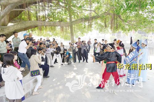 22日上午,记者跟随摄影爱好者们前往南潮社区大乡池渡头路、五村征兴居、南潮渡头、柑园、邵业居、吴氏家庙等地,亲身感受大家积极创作的热情和专注。在现场,迎着大乡池中吹来的微风,化着精致妆容的“小梅花”演员们表演了流畅的走位、经典的动作,数十位潮乐爱好者正坐在大树下演奏弦乐,一位渔夫撑着小渔船悠然自得地来回划动……瞬时,快门声、镁光灯“刷刷刷”地响起,数百位摄影爱好者拿着“长枪短炮”,聚焦水乡生态人文之美,一些过来看热闹的村民也纷纷拿出手机拍照。