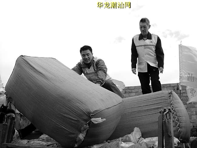 (图为义工张辉烁正在搬运物资。)