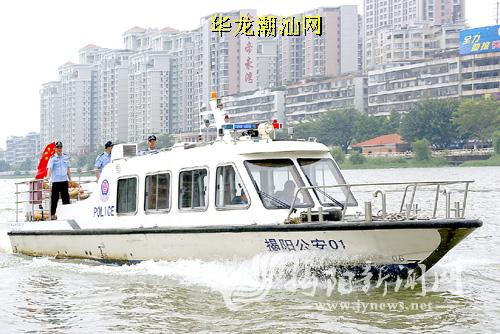 图为水上派出所民警在榕江河道上开展治安巡逻。陈路文 摄