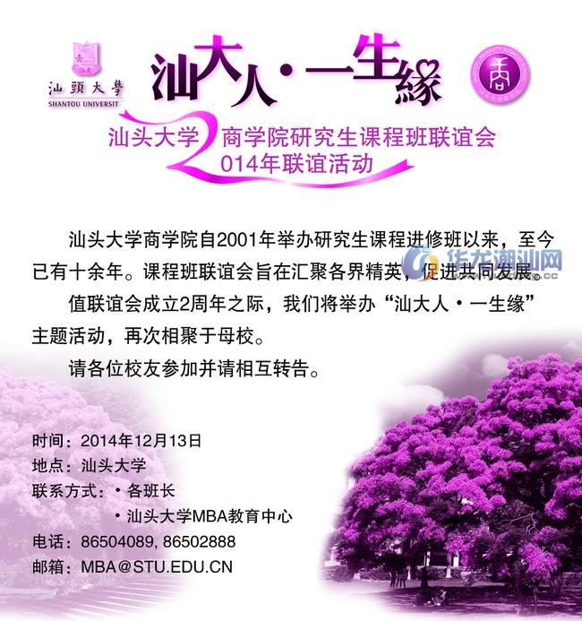 本网讯:汕头大学商学院研究生课程班联谊会本月13日举办“汕大人 · 一生缘”主题活动,在课程班联谊会成立2周年之际再次相聚于母校,旨在汇聚各界精英共叙友情,促进共同发展。