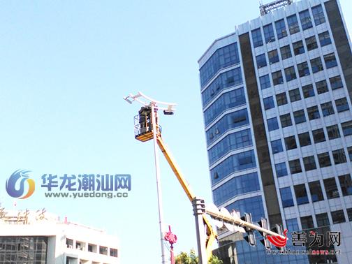 市路灯管理部门对市区损坏的路灯进行维修更换