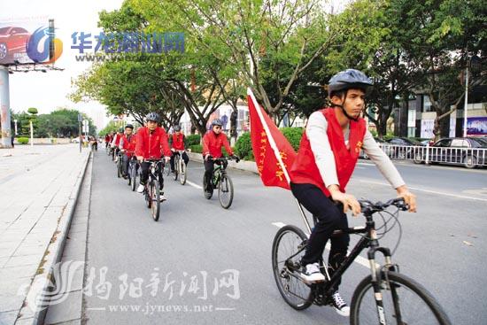 5日,参加绿色骑行活动的志愿者,以骑行方式向市民宣传低碳生活,倡导生态文明,绿色出行。林碧鸿 摄