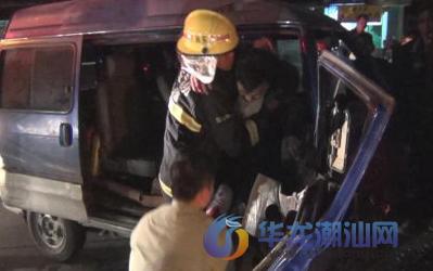 本报讯 记者李伟烽摄影报道:12月4日晚上7时许,位于澄海区东里大桥前发生一起交通事故,一辆小面包车失控撞在桥边上,有人员被困驾驶室内,急需救援。澄海消防官兵接报后迅速前往救援。 车祸是一辆小面包车因失控打滑造成的,在事故现场,该小面包车车头已经严重变形,挡风玻璃粉碎一地。救援人员立即利用液压破拆工具进行施救。2名官兵利用液压剪扩器将左侧车门破拆后,1名官兵迅速清理司机身边的杂物,并用手撑住车门防止掉落,其他人员负责警戒现场并指挥过往车辆,避免发生二次事故。经过大约15分钟后,成功将被困司机救出。