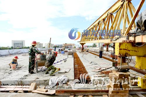国道206线枫口大桥全桥长205.34米,桥宽36.5米。自今年3月28日发现大桥险情以来,我市各级党政高度重视,采取措施对大桥主体结构进行加宽、加固。目前半幅桥面已基本铺设完成,可望今年底前实现大桥半幅通车。 郑楚藩 摄