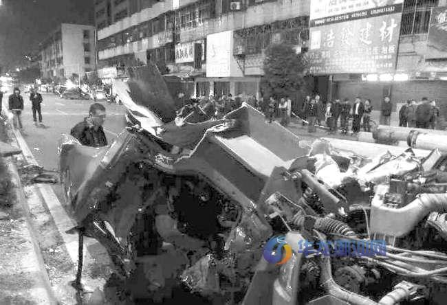 在增援的重型吊臂车到达现场后,压在驾驶室上方的巨大水泥柱被迅速移除,悬在被困司机和消防救援人员上方的安全隐患被解除。随后消防攻坚组利用液压剪扩张器、撬杠等工具对车辆进行逐步破拆。经过2个小时紧张有序的救援,被困者被成功救出。目前,事故原因还在进一步调查中。 图为车祸现场。(现场照片由网友提供)
