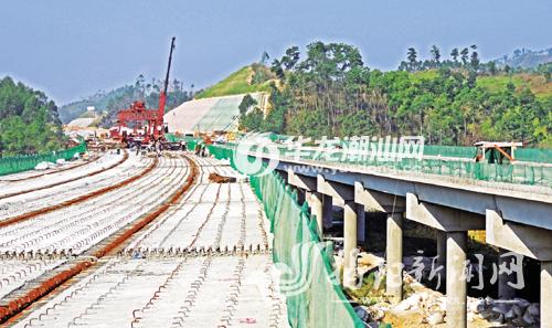位于揭西县龙潭镇的汕湛高速揭博项目T1标省道335跨线桥设计为左右线分离,该桥预制小箱梁110片,目前已全部架设完成,工程现正抓紧施工,力争本月中旬全桥贯通。图为省道335跨线桥施工场面。特约记者 李维照 摄