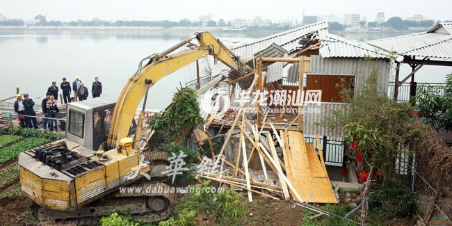 为有效推进专项整治工作,昨天上午,在市和澄海区两级河道堤防专项整治工作领导小组的统一组织下,澄华街道以及公安、水务、城管、供电、供水等相关部门共派出200多人,出动两台钩机,依法拆除违法建(构)物25宗,面积逾2700平方米。“全区共摸查出717宗违法建构(筑)物,目前自行拆除仅有76宗。”澄海区河道堤防专项整治工作领导小组有关负责人表示,此次强拆行动是专项整治工作的序幕,澄海区将按照市里的专项工作部署,以街道(镇)作为依法强拆的主体,在区联合执法队的配合下,在本月15日前基本拆除全部违建。