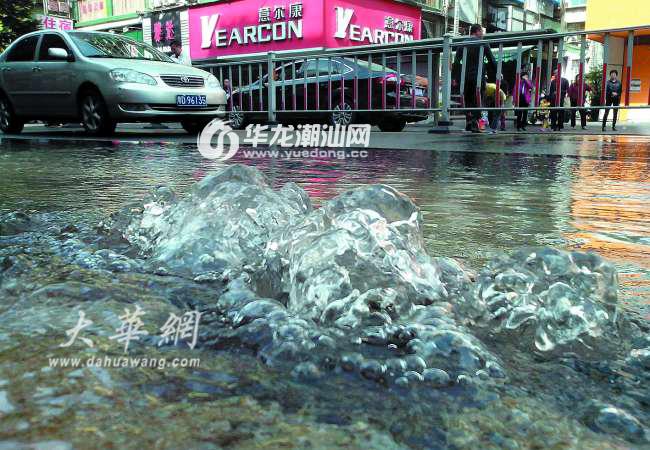 本报讯(记者林子海 林鹏 摄影报道) 昨天上午,长平路长发大厦前路段路面突然汩汩冒水(左图),经勘查是路面下埋设的供水干管破裂,自来水渗漏出来,市自来水总公司急修队伍马上到场展开了抢修工作,预计水管修复工作将于今天完成。