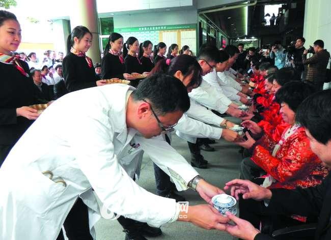 此外,市中医医院不断优化和完善人才培养方案,积极推进“名医师带徒”工作,并在粤东地区设立了首家“名中医工作室”。医院前期已先后推荐并确定了十余人为“师带徒”指导老师,共带教本院业务骨干数十人。目前医院再指定20位在学术上有一定造诣、具有丰富临床经验并在粤东地区有一定影响力的中医专家作为指导老师,将带教40位学员,这些学员则是在高校接受过系统医学理论知识的年轻医生。昨天上午,医院隆重举行“名中医师带徒”传统拜师仪式。名中医代表们身着统一唐装出席仪式,年轻弟子们则站成一排,双手举过头顶并屈身将拜师帖呈给名中医,然后面对师父行叩拜大礼,随后再恭敬地为师父献上“改口茶”,而师父们则回赠弟子中医经典书籍。据悉,“师带徒”为千百年来中医药人才培养的主要模式,历代中医药名家独到的技术经验,需一代又一代的后学者长期跟师实践,通过朝夕临诊、耳濡目染、口授心传才能逐步领会和深入掌握,避免走弯路,缩短成才周期。