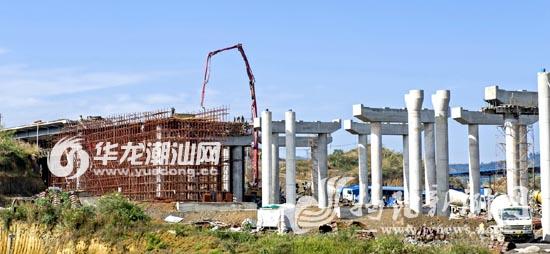 潮惠高速TJ6合同段杨林枢纽主线桥位于揭西县大溪镇,是汕湛、潮惠高速交汇点。自去年开工以来进展顺利,已完成总工程量的70%,其中,72 根桩基、30座系梁承台、56个墩柱、20座盖梁已全部完成,小箱梁预制已完成一部分生产任务,左幅现浇箱梁已经完成,右幅现浇箱梁正在搭设支架。据了解,该工程由中铁十四局集团有限公司承建,目前,工人正在加班加点施工,力争在春节前完成右幅的现浇箱梁施工任务。图为该工程施工场面。