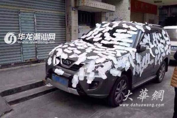 许先生告诉记者,昨天上午8点多,他准备上班时,发现就在金砂东门大路东31巷20号门口围了一群人,出于好奇他凑上前一看,然而眼前的一幕却让他顿时“惊呆了”——停放在路边的一辆深色的奇瑞越野车,车身上被贴上了数十片白色的卫生巾。“当时是又惊讶又好笑,这越野车的车主要是看到了一定得气疯了”,许先生说,当时自己跟众多围观者一样,用手机拍下了这好笑的一幕后就离开了,至于这辆车为何会遭遇如此恶搞,许先生怀疑可能是车子堵到了别人的路。