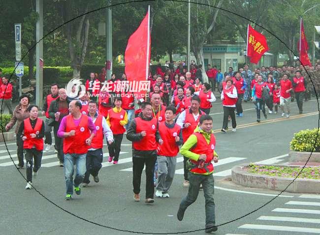 今晨细雨霏霏,市人民广场彩旗飘飘,人头攒动,我市各行各业近万名干部群众汇聚在这里,参加一年一度的汕头市迎新年“金味万人健身跑”活动。7点30分,市委副书记孙光辉向长跑前导队授旗,紧接着,副市长徐凯一声令下,两枚彩色信号弹直冲云霄,长跑队伍浩浩荡荡从人民广场出发。