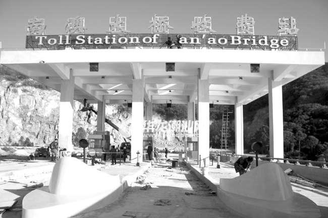 本报讯v记者 杨立轩 蔡晓丹w 南澳大桥即将迎来试通车的日子,D城市民尤其是南澳岛民都关心着大桥配套设施完善的最新进度。昨天下午,记者再次登桥体验,只见大桥的交通指示牌已基本安装完毕,位于南澳岛侧收费站也即将完工。