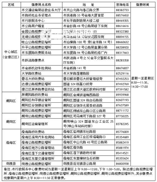 汕头市路桥收费管理处发布敬告,根据《广东省交通运输厅 广东省发展改革委关于汕头市继续试行车辆通行费年票制有关问题的复函》精神,为做好2015年度年票通行费征收工作,现将有关事项敬告如下: 一、2015年度年票通行费统缴期为2015年1月5日至3月31日,全市共设28个缴费点,分布在中心城区(含濠江区)、潮阳区、潮南区、澄海区、南澳县,车主可就近办理缴费手续。缴费时间为星期一至五上午8:30—11:30、下午14:30-17:00,为方便车主缴费,统缴期内部分缴费点星期六上午正常上班(其中市行政服务中心缴费点按照中心统一服务时间)。逾期缴费的从欠费之日起按日加收应缴费额2‰的滞纳金。缴费地点及时间详见下表: