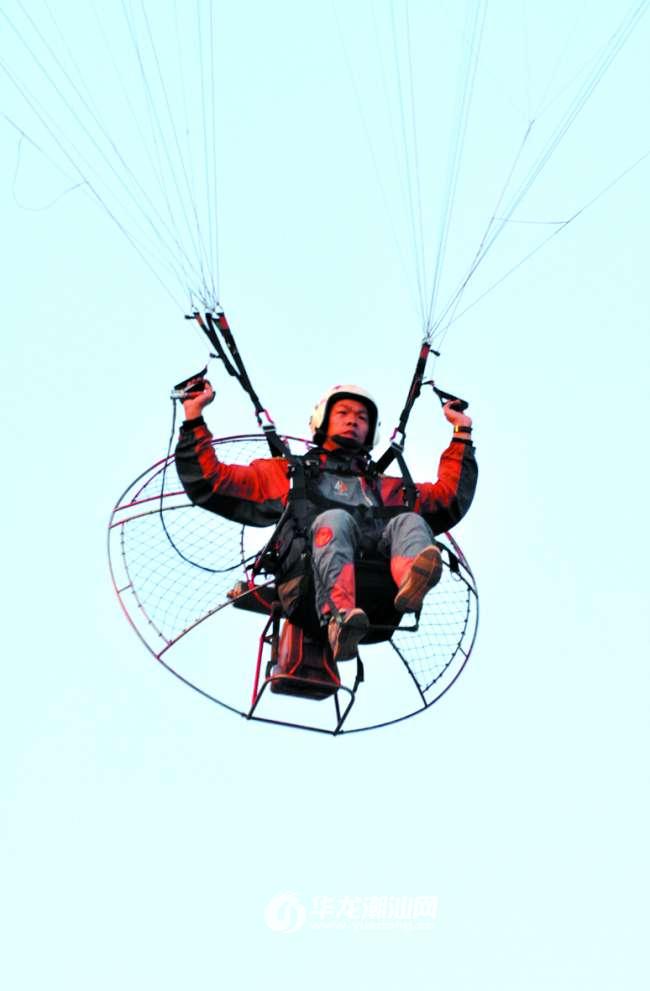 本报讯(记者 方晓F 袁笙 摄影报道) 近日,D城上空出现了奇特的一幕——数架形似降落伞的飞行器载着人在空中徐徐飞翔,时而向东,时而向西,引得无数路人驻足观看。城市上空出现“飞人”,这在汕头还是头一遭。这些“空中飞人”到底在干啥?记者随即走访了一番。