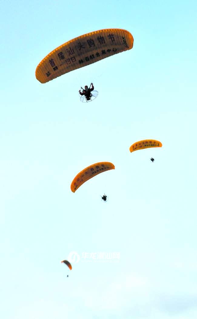 昨天中午,记者来到林百欣国际会展中心附近寻访神秘的“空中飞人”,几经询问才得知,原来这是商家用动力滑翔伞做广告。据展会现场工作的负责人杨先生介绍,为了配合此次在会展中心广场举行的购物节活动,组委会特地邀请了动力伞表演队来汕作户外宣传,为商家打广告,希望能借这样一种特别的宣传形式吸引更多的顾客。