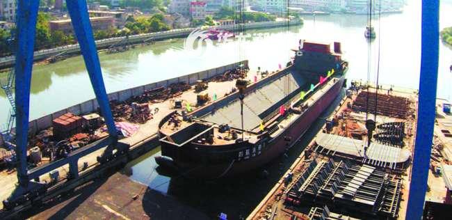 新年伊始,汕头造船厂建造的3000吨自航自卸式运砂船顺利完成下水,作为2015年第一艘船舶顺利下水,实现造船生产开门红。该船全长88.50米,型宽18.5米,型深 6.00 米,吃水 4.6米,满载排水量约6324.8吨。砂船建成以后,将参与援外工程建设。本报记者 张烈华 摄