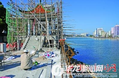 饶平县黄冈河沿河南北路凤江桥至东溪水闸段工程建设进展顺利。该工程主要清理拆除违章搭建物,加固两岸堤围并配套景观长廊,建设2.5米宽花圃、改造沿堤两座进水闸等,总投资2705万元。至目前,左、右岸水下桩基础平台和灌注桩都已完成建设任务,右岸沿河南路已完成两个仿古亭结构浇筑、部分外景设施和820米长廊面板;左岸沿河北路已完成1个仿古亭和5个景观平台结构浇筑以及700米长廊面板,工程预计今年春节前后全面完成。据了解,该工程将提高设防标准和水利防灾减灾能力,同时显著改善县城交通状况和两岸景观,提升县城环境品位。图为昨天上午黄冈河右岸沿河南路仿古亭施工现场。