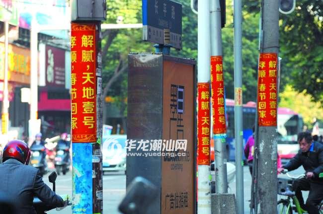 临近年关,商家们“广告大战”又拉开了帷幕,但某醋饮商家却把长平路、金新路、金园路等交通要道当成了广告的宣传阵地,沿路分布的路灯杆都贴满了某醋饮的广告海报(如图)。市民们说,如此街边乱贴“牛皮癣”的现象的确应引起有关部门关注,采取措施进行整治。